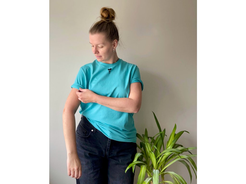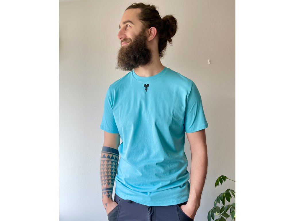 Logo na přední straně je také natištěné sítotiskem v černé barvě, stejně tak jako pokyny k praní v černé barvě uvnitř trička.
