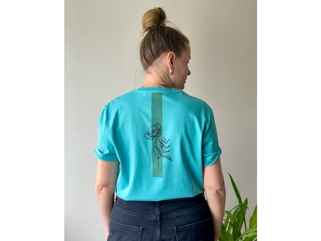 Tričko z organické bavlny s kombinovaným ručním tiskem, volného unisex střihu. Motiv vlčího máku je natisknut na zadní straně trička ručním sítotiskem černou barvou v kombinaci obtisknutého proužku. Jedinečný odstín zelené, který jsem namíchala speciálně pro toto tričko.