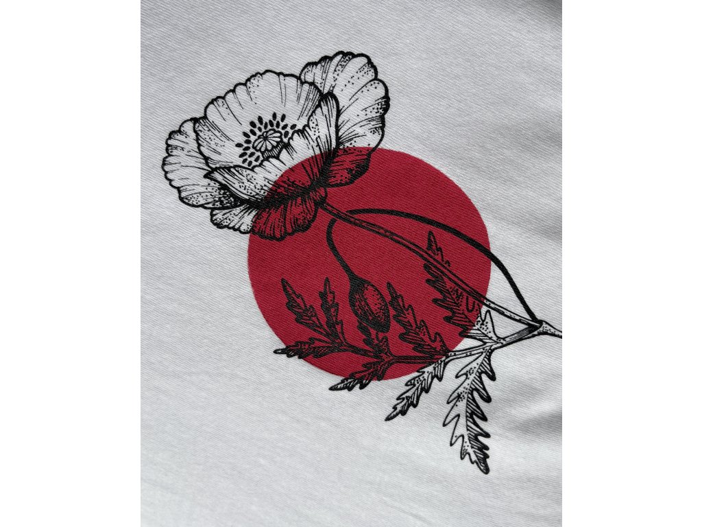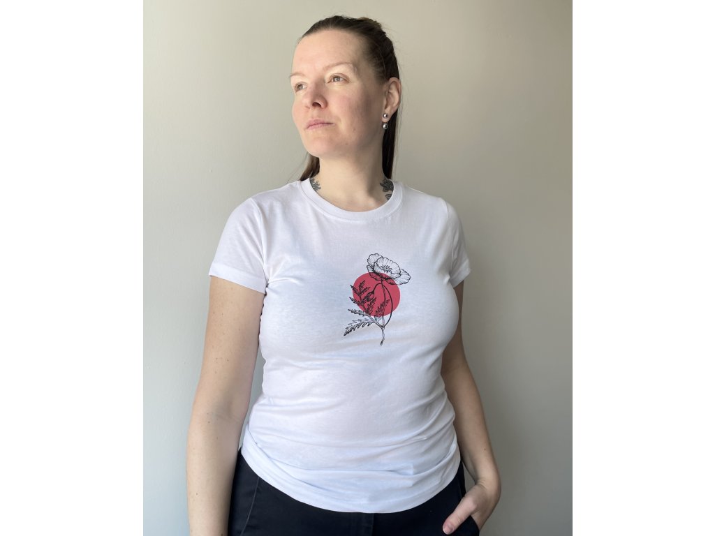 Tričko z organické bavlny s kombinovaným ručním tiskem. Motiv vlčího máku je natisknut ručním sítotiskem černou barvou v kombinaci obtisknutého puntíku. Jedinečný odstín červené, který jsem namíchala speciálně pro toto tričko.