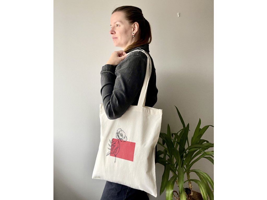 Praktická a jedinečná, nejen to je plátěnka od kreslím tečky čárky. Stejně jako trička, tak i tato plátěná taška je z organické bavlny. Rozsviťte minimalistický outfit taškou s originálním ručním potiskem. Motiv je kombinací sítotiskového tisku vlčího máku s podkladem obdélníku. Geometrický tvar nese jedinečný barevný odstín, který jsem namíchala jen a pouze pro tuto tašku.